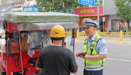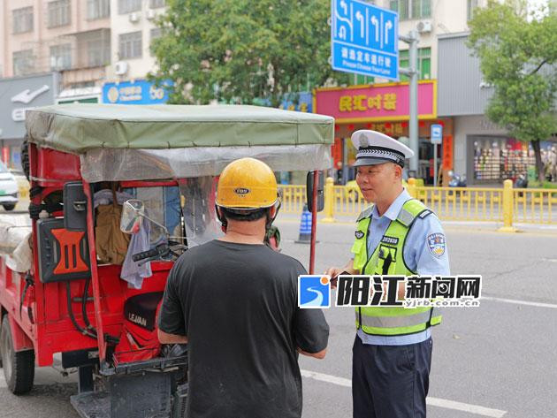 执法人员向三轮车车主宣传交通安全规则。梁园 摄