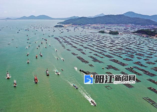 2019年8月16日,闸坡渔港千帆竞发,经过网箱养殖基地出海捕鱼。