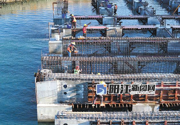 当日上午,记者来到位于闸坡渔港码头的施工现场,只见吊机正将施工材料运送至海上施工平台,40多名工人分布在桩帽、横梁等工作面同步施工,进行绑扎钢筋、安装模板、浇筑混凝土作业,并对上部结构现浇面板进行养护,到处是忙碌景象。旧码头扩建改造是在原有旧码头前沿扩建高桩梁板式码头,扩建码头长度292.7米,宽度20.85米。随着桩基施工完成,施工方加快上部结构施工进度,现浇梁板铺设已完成235米。
