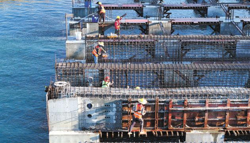 闸坡世界级渔港项目旧码头扩建工程桩基施工已完成,目前正在进行上部结构面板、现浇梁施工。 梁文栋 摄