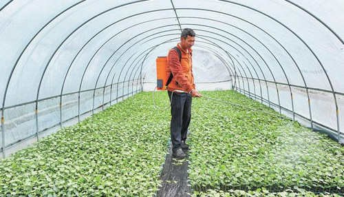 随后,孙旭权带领记者来到另一处圣女果种植基地。该基地种植圣女果面积共8亩,几名村民正在采摘成熟的圣女果。“我们通过喷洒氨基酸水溶肥和芸苔素等叶面肥,增强圣女果的耐寒能力。”孙旭权背着喷洒设备一边喷洒一边介绍。圣女果的耐寒能力较强,目前的温度并不会对其造成太大影响。同时,孙旭权组织村民进行抢收,及时采摘已经成熟的圣女果,降低寒冷天气带来的风险。