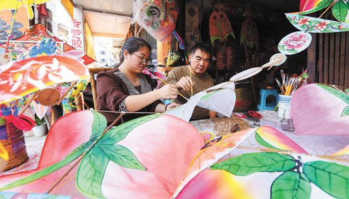 从选竹料、晒竹、劈条,到扎制、蒙纸、绘图上色,十几道工序全部手工完成,严格遵循“扎、糊、绘、放”传统风筝制作技艺。作为梁家风筝的第五代传人,梁淑娴说,做风筝要耐得住枯燥,每天重复同样的内容,一天甚至几天才能完成一架风筝;同时又容不得半点马虎,定型时需对风筝的每个角度、长度等进行精确计算,确保风筝能在风中平稳飞行。