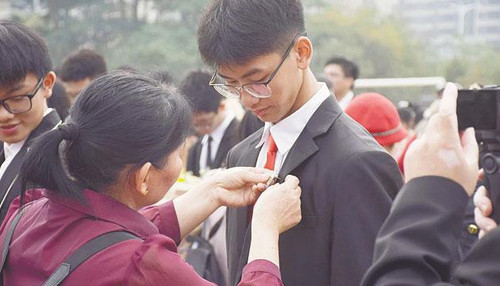 学生和家长都提前写好了家书,在当天向彼此读出自己的心声,以特殊的方式进行心灵的沟通。家长为学生佩戴了成人纪念章(如上图 黄早瑾 摄),并赠送《中华人民共和国宪法》。同学们向家长、老师鞠躬行感恩礼,表达感激与敬意。然后,他们迈着坚定的步伐,走过了成人门,开始承大任;走过成功门,未来事可成。 童瑶