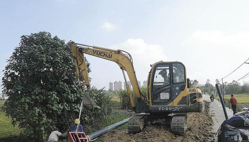 施工人员正在铺设自来水管道。 陈海涛 摄