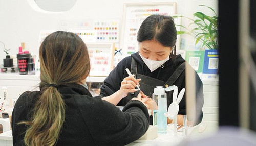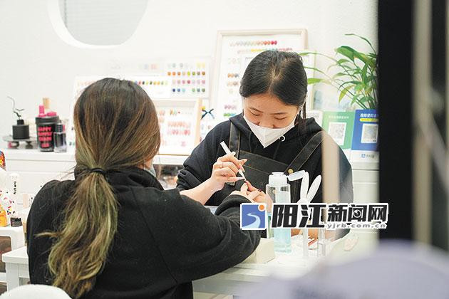 美甲师正在给顾客美甲上色。 林倩宇 摄