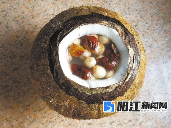 ●食材:老椰子一只,土鸡半只,姜片,红枣、枸杞、党参各适量。
