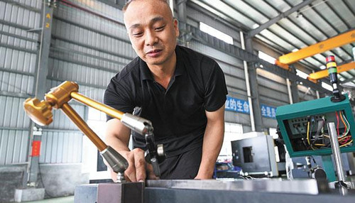 大机器,做细活。在公司的生产车间里,记者看到一名技术工人正在用千分表检测长方体零部件,只见其用手缓慢地推动零部件在千分表的指针上移动,并盯着观察仪表上的数值变化。“如果误差偏大,就要‘返工’。”该名技术工人告诉记者,旁边打磨零件的数控机床,也是他们公司生产的。