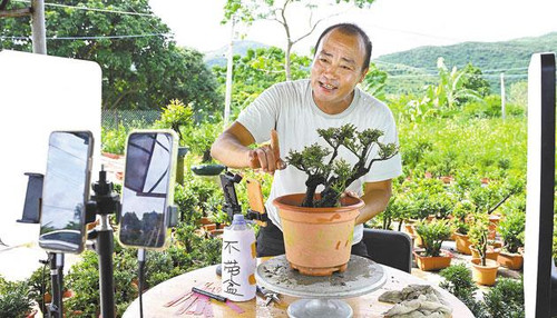 黑骨茶种植基地的工作人员在直播销售黑骨茶。 梁文栋 摄