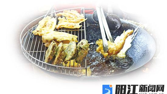 “咬一口,酥酥脆脆的,不愧是阳江‘天妇罗’。”从广州来阳西月亮湾度假的骆女士告诉记者,她提前在网上查了攻略,了解到阳西有一道当地特色美食——上洋鱼乕,于是特地驱车前来打卡。鱼乕是上洋镇一种最常见的美食,将蚝、鱿鱼、海虾等海产品作为馅料,加以面浆,用油滚炸而成。适宜的火候使得整个鱼乕口感酥松香脆,里面的馅料原汁原味,非常鲜甜。