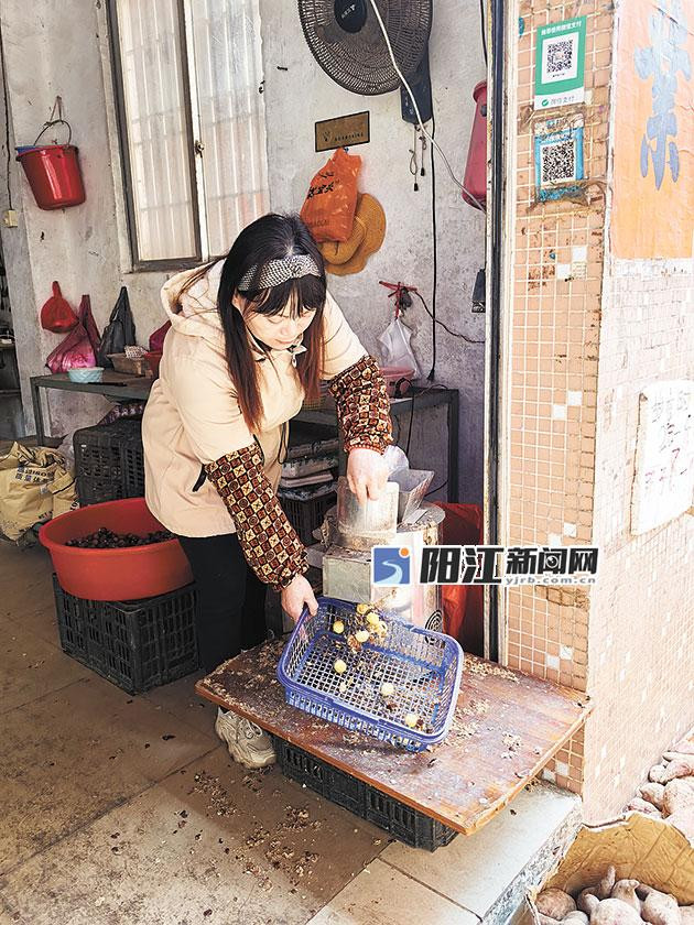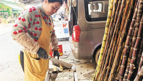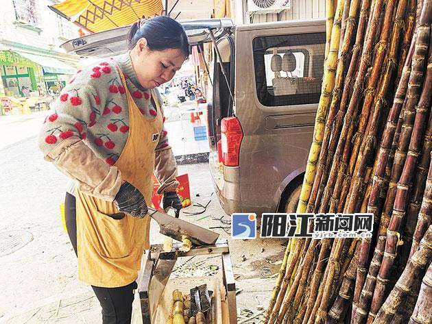 在东湖市场附近一家水果店,店主正在为顾客处理甘蔗。只见她把一根新鲜的甘蔗砍成几段,再把皮削去,然后放到铡刀上,咔咔几下,约3厘米长一小节的甘蔗便滚落到袋中。不出片刻,整根甘蔗就已铡好递到顾客手中,并没有收取额外的费用。“阳江普遍卖甘蔗都是砍段、削皮便装袋了,目前像我这样还铡成节的比较少,增添服务能带动甘蔗销量。”店主说,虽然甘蔗已削皮并砍成一段段,但有的市民觉得吃起来仍然不方便,为了招揽生意,她将服务升级,购买了工具,将削皮后的甘蔗再加工铡成两三厘米长的小节,满足不同群体的需求。