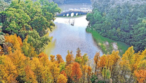 冬日火红的水杉,以其独特的魅力点缀着城市的每一个角落。从金山植物公园到鸳鸯湖公园,从江湾公园到碧田湖公园,水杉的身影无处不在。尤其在鸳鸯湖公园的月亮桥周边和双飞蝴蝶岛一带,水杉的色相变化最为壮观,是市区秋冬季节拍摄水杉的胜地。