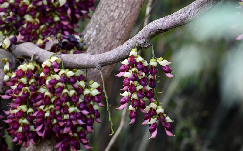 2月28日,记者在上禾叉坳村一棵古榕树下看到,碗口粗的禾雀花藤蔓如游龙盘桓,缠绕在榕树的枝干上,成串的禾雀花簇拥在藤蔓上,树冠仿佛成了一座“花架子”。细观垂坠的紫色花串,每朵花都似精工雕刻的禾雀:翡翠色花托恰似禾雀昂首,两侧的花瓣卷拢成翅状,正中的一瓣弯弓似雀背,底瓣后伸似为尾巴,最妙是花托上的两点墨色斑纹,宛如灵动的雀眼。当风掠过,紫色“羽翼”在风中轻摆,宛若群雀振翅欲破藤而出。