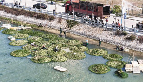 近日,在沙扒镇渡头村海仔湖,大片的海菜生长在水中,渔民身着防水服,一边用绳子牵引着小船,一边手持竹竿熟练地将海菜捞起。岸边的渔民表示,近期随着气温逐渐回暖,海菜繁殖进入高峰期。他们从早上6点打捞到下午1点,一人一天最多可以打捞3000多公斤海菜,上岸就有收购商当场收购,每天能带来四五百元收入,是休渔期渔民增收的好门路。