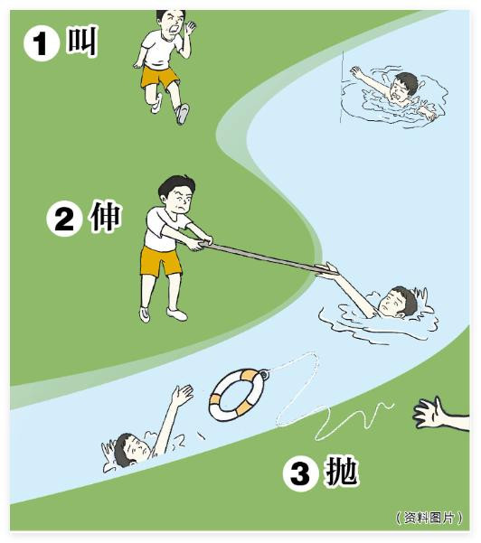 据介绍,“叫”是指第一时间向周围大声呼喊寻求成年人帮助,以及拨打110、119、120等救援电话。“伸”是指向溺水者递送延伸物,如将木棍、竹竿等伸向溺水者,将其拖拽上岸,且递送延伸物时,必须站在安全牢固的位置,拖拽时降低自身重心,以保证自己不会被拖下水为前提。“抛”是指将绳索、救生圈等能漂浮的物品抛给溺水者,为其提供浮力,但要注意绳索末端不可以缠绕固定在施救者的手上或身上。