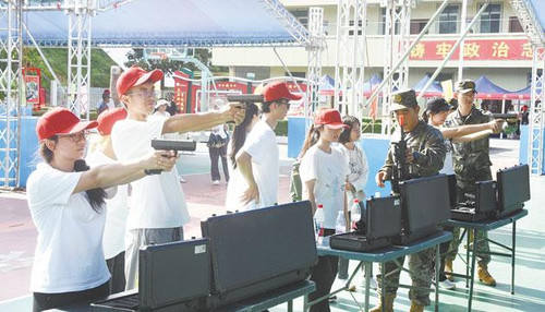 代表们在官兵指导下体验模拟射击。 陈建华 摄