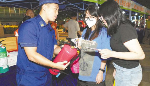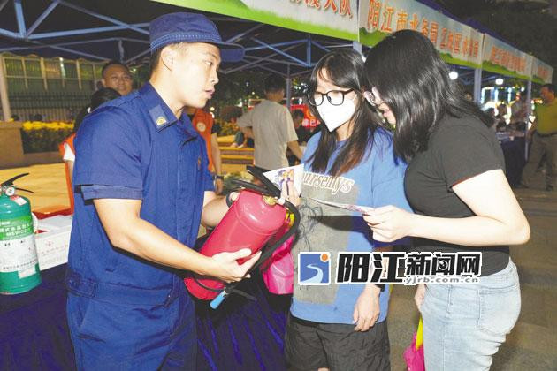消防员正在向市民讲解灭火器的相关知识。 袁荣泽 摄