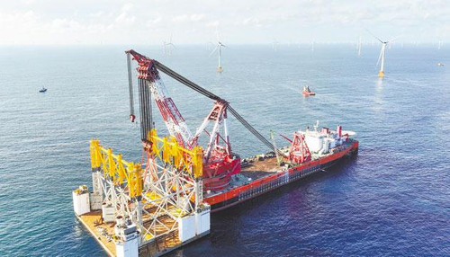 巨型起吊船正在进行海上换流站下部结构安装作业。 梁文栋 摄
