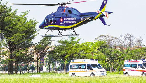 “发现危重伤员,需立即转运!”AW119专业医疗构型直升机迅速抵达现场,医护人员将“伤员”抬上机舱并送往后方医院。水上救援分队同步展开搜救,成功营救“落水人员”。岸边的帐篷医院内,医护人员正有序开展损伤控制性手术。