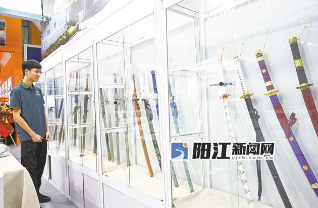 行走在展馆中,跨界融合的创新之风,吹遍了整个展馆。镶嵌阳江传统漆艺的刀柄、可作为客厅装饰的仿古宝剑、动漫主题的定制刀剑……这些装饰类五金产品,让参观者眼前一亮,颠覆了刀剪作为“工具”的固有定位。