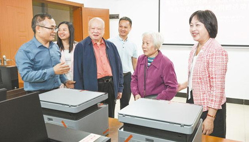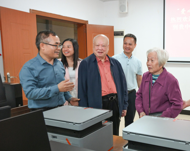 许荣典、敖道霞伉俪(前排右一、右二)在工作人员的陪同下参观他们捐赠的设备。 梁文栋 摄