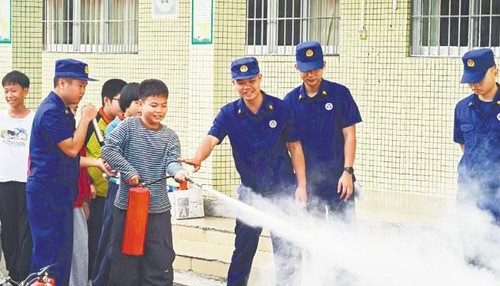 学生在消防员的指导下使用灭火器。 市消防救援支队 供图