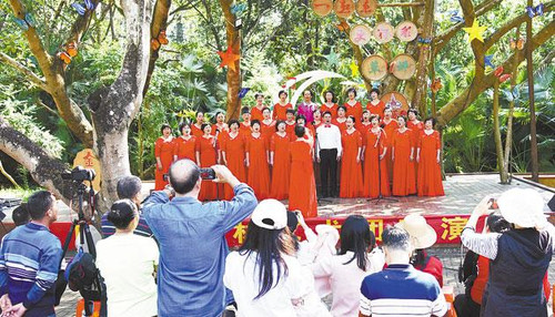 11月15日,市民在市区金山植物公园欣赏大合唱,纷纷举起相机和手机拍摄精彩的一瞬。当日,由市政协等单位主办的“一起来 更精彩”文艺志愿者惠演活动吸引了众多市民前来观赏。 刘再扬 摄影报道