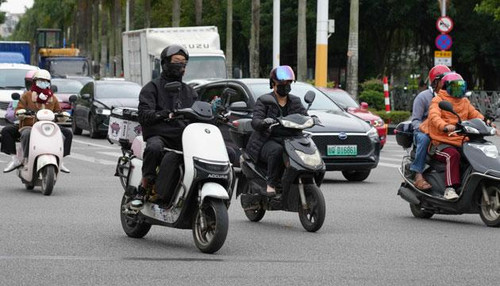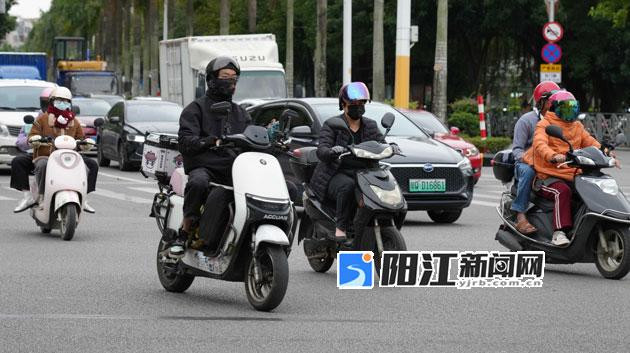 “全副武装”的市民在冷风中驾驶电动车、摩托车。 袁荣泽 摄