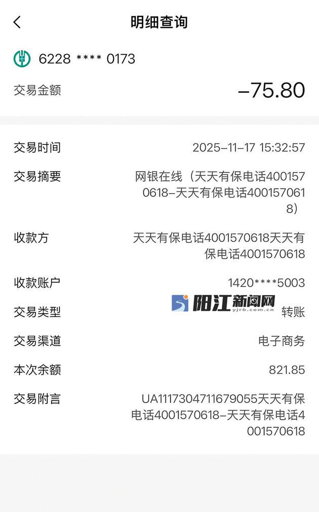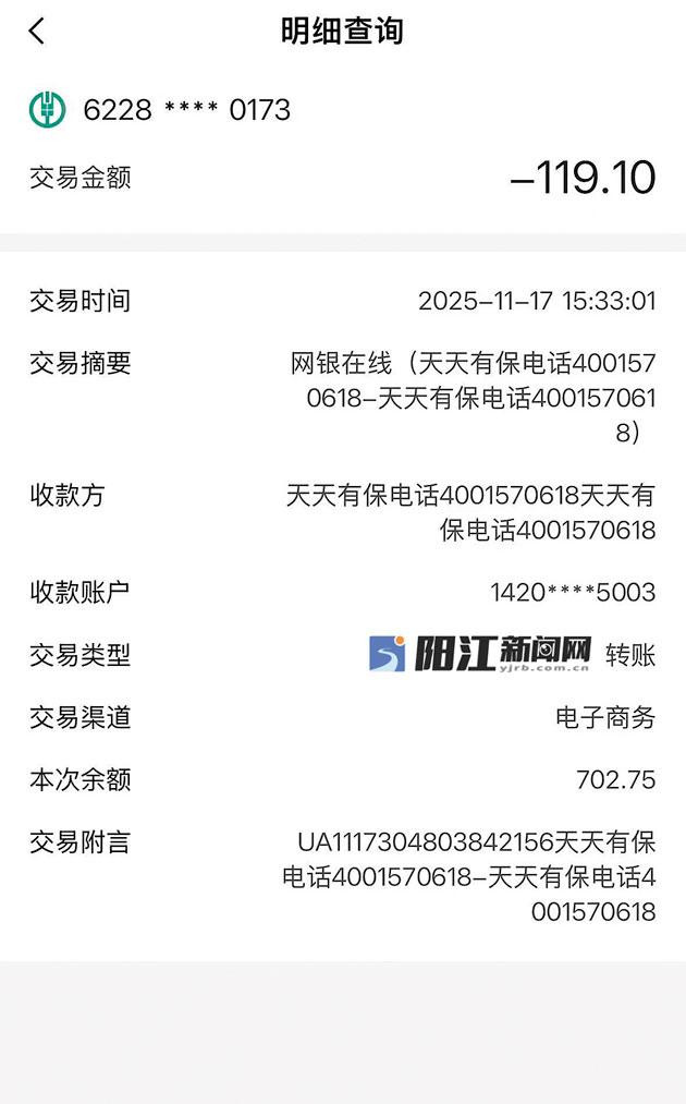 等到11月21日,冯琪突然发现自己用来支付房贷的银行卡显示余额不足,她查询后才发现自己莫名其妙被扣了两次款,用来购买了两份“惠康保·医疗险”,保障期限是11月18日至12月17日。冯琪向记者提供的扣款截图(如上图)显示,10月17日,其两次被扣款0.6元。同日,她又分别被扣款75.8元、119.1元,对方户名均为天天有保(湖南)保险经纪服务有限公司。