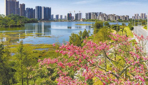 成排的异木棉花与湖中的倒影为景区增辉。 张晓山 摄
