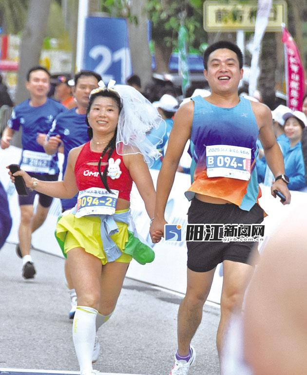 “祝贺你,恭喜完赛!”在赛道终点处,来自阳江职业学院的志愿者们身着正装,为冲线的女性选手送上玫瑰和祝福。
