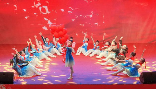 少先队员向恩阳台独立大队大队长马德里的后人(右三)及容基烈士亲属献花。 钟盛 摄