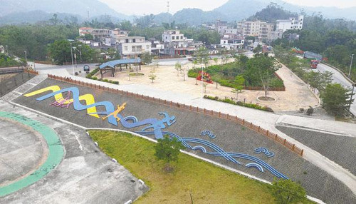 河口镇新建的党建公园和焕然一新的河堤。 袁荣泽 摄