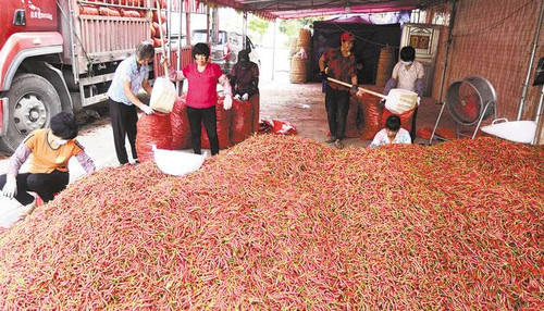 1月5日,笔者走进潭水镇广力新城大街蔬菜交易购销市场,只见收购的尖椒堆成小山,工人们正忙着打包、装车。菜农则用二轮、三轮摩托车载着一担担红尖椒、指天椒、青尖椒等从四面八方运来。据了解, 潭水镇建立了以盘安、塘尾、东湖等村为主的秋植指天椒基地,种下秋植尖椒3500亩,品种有中国红、锦绣中华、华宝朝天椒等。 目前,该镇尖椒陆续收获上市,价格一路走高,其中指天椒每斤收购价17元,主要销往珠江三角、湖南、江西等地。 文/图 刘贻汪