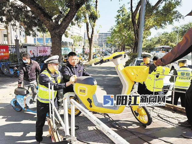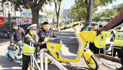 多部门联合执法整治乱停乱放的共享电动自行车。 梁园 摄