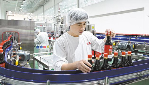 在这里,预制好的原料通过全自动生产线,依次完成冲瓶、灌装、压盖、液位检测、贴标、喷码、套膜、包装等工序,并历经四道严格检测。最终,一箱箱合格成品经传送带运往立体仓库。包括糯米甜醋、酱油、蚝油、调味粉在内的数百种产品,正是在这样严密高效的生产线上有序产出,单一生产线每小时最高产能可达2.4万瓶。