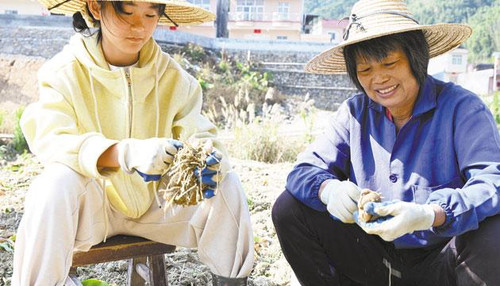 农户正在沙姜地里采收沙姜。 陈建华 摄
