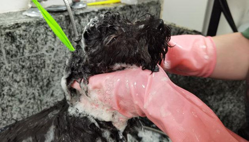 宠物护理店工作人员为小狗洗澡。