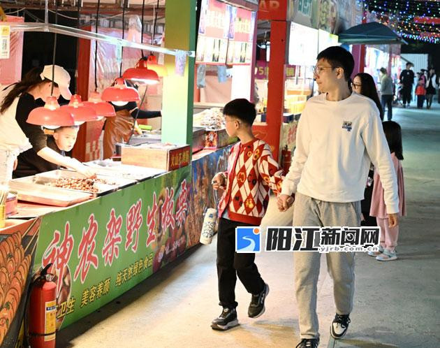一个男孩在家长陪同下走过阳东区竹篙山夜市,他被美食摊深深吸引。 陈建华 摄