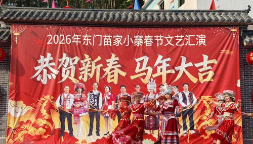 阳江日报讯(记者/陈海涛)2月20日大年初四,天气晴好。江城区双捷镇乐安村的东门苗家小寨年味正浓,苗族村民载歌载舞迎客来。寨门前,车辆陆续驶入停车场内,游客走进寨中体验苗家特色风俗。截至当天,苗家小寨春节假期已接待游客上万人次。