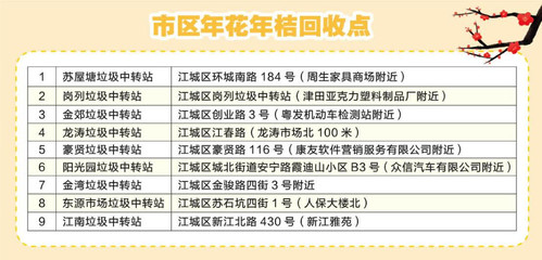 阳江日报讯(记者/刘昭融)春节后,装点节日氛围的年花年桔陆续“下岗”,如何处理这些年花年桔呢?这是不少市民遇到的问题。日前,记者走访了解到,市区设置了9处年花年桔回收点,方便群众就近投放,以规范节后废弃年花年桔处置,维护市容环境整洁。