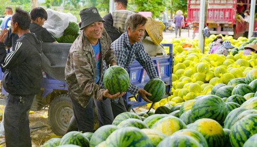 瓜农将刚采摘的西瓜送至收购点。李凯 摄