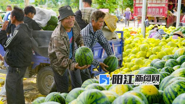 在阳西县上洋镇双鱼村的连片瓜田,放眼望去,绿油油的瓜田如一张张地毯铺展,一个个圆润饱满的西瓜掩映在繁茂枝叶间。瓜农们穿梭在瓜垄间,忙着采摘、搬运成熟果实。