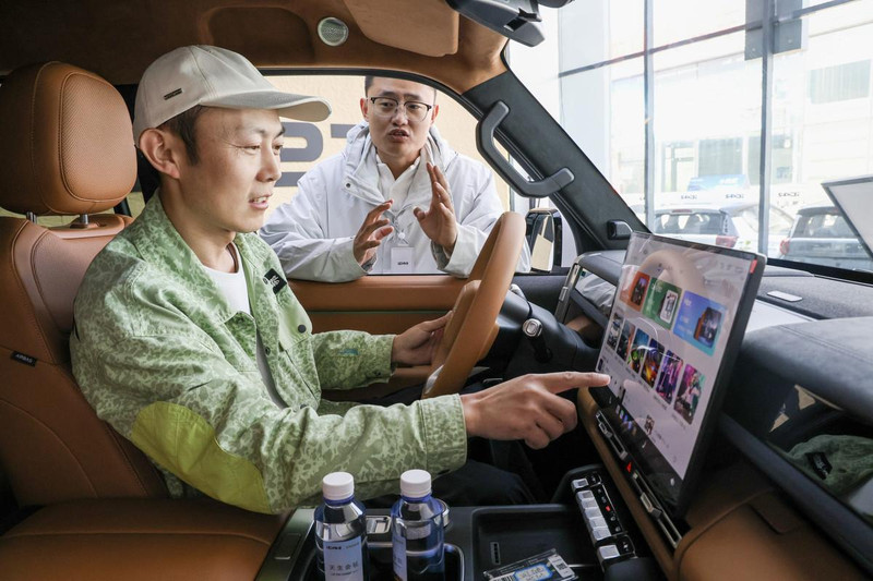 4月10日,消费者在山东省滕州市一家汽车销售中心选购新能源汽车。