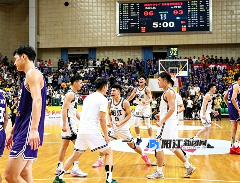 比赛结束,比分定格在96:93,阳江队员欢庆胜利。