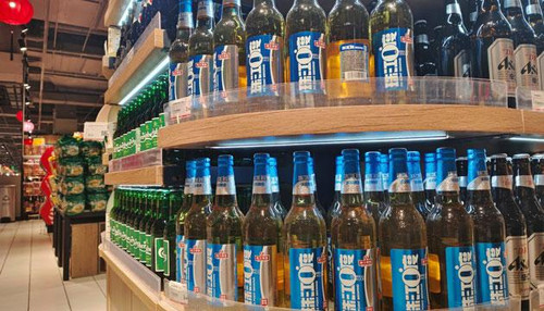 超市货架上摆放的“0度啤酒”。官文婷 摄