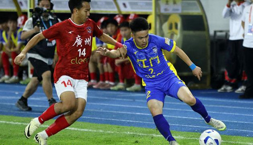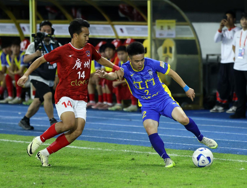 江门队球员伍永贤(右)和广州队球员钱俊文在比赛中拼抢。最终,广州队2:0战胜江门队。新华社发