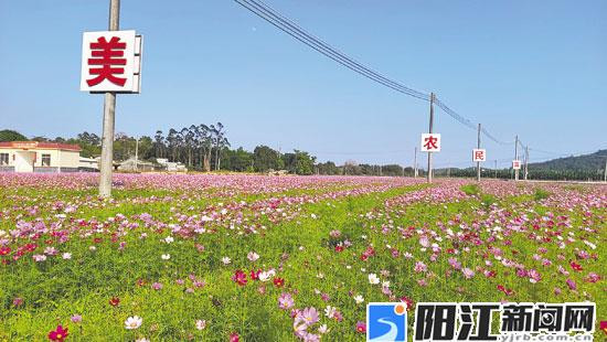 阳江日报讯(记者/任明皓)蓝天白云下,一朵朵波斯菊在寒风中竞相绽放,橙色、黄色、紫色……40亩波斯菊在近日陆续开花,为阳东区那龙镇亨垌村增添了一抹靓丽色彩。