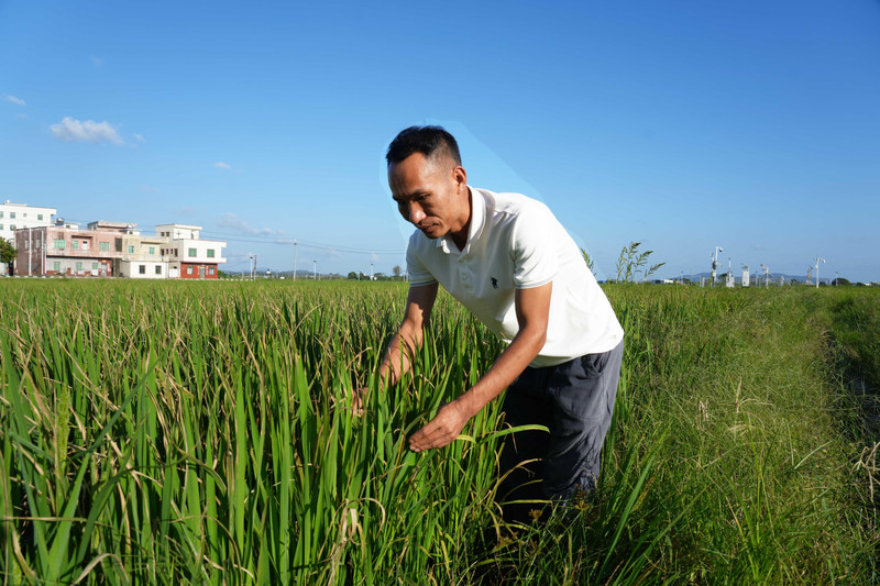 10月中旬,位于阳西县儒洞镇边海村的国家级水稻优良品种示范基地——边海丝苗米基地里,近千亩连片稻田已进入孕穗期,微风拂过,送来阵阵清新的稻香。“再有个把月,就是丰收的时候了。”稻田里,一位脸庞黝黑、身板笔挺的汉子俯下身,小心翼翼地拨开稻叶,仔细察看水稻长势。