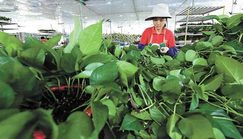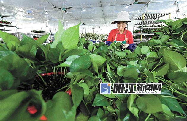 记者来采访时,卢燕秋正在专心地扦插绿萝种苗。只见她往红色的塑料花盆中倒入肥料和营养土,再迅速地把绿萝种苗一株株地插入盆中,不用多久一盆生机盎然的绿萝盆栽就扦插完成了。绿萝扦插工作难度较小、上手快,目前卢燕秋已经成长为熟练的绿萝盆景扦插工人,每月有2000多元的收入,并可兼顾家里农活和家务。